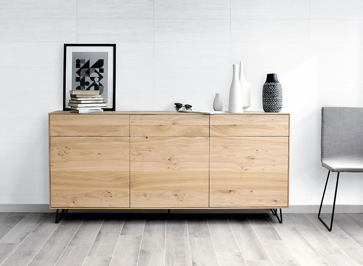 Aparador fabricado en maderas naturales y con un diseño nórdico .Disponible en acabados red gun, nogal, distintos robles y lacados. Diferentes distribuciones y medidas 160- 180 – 200 cm.