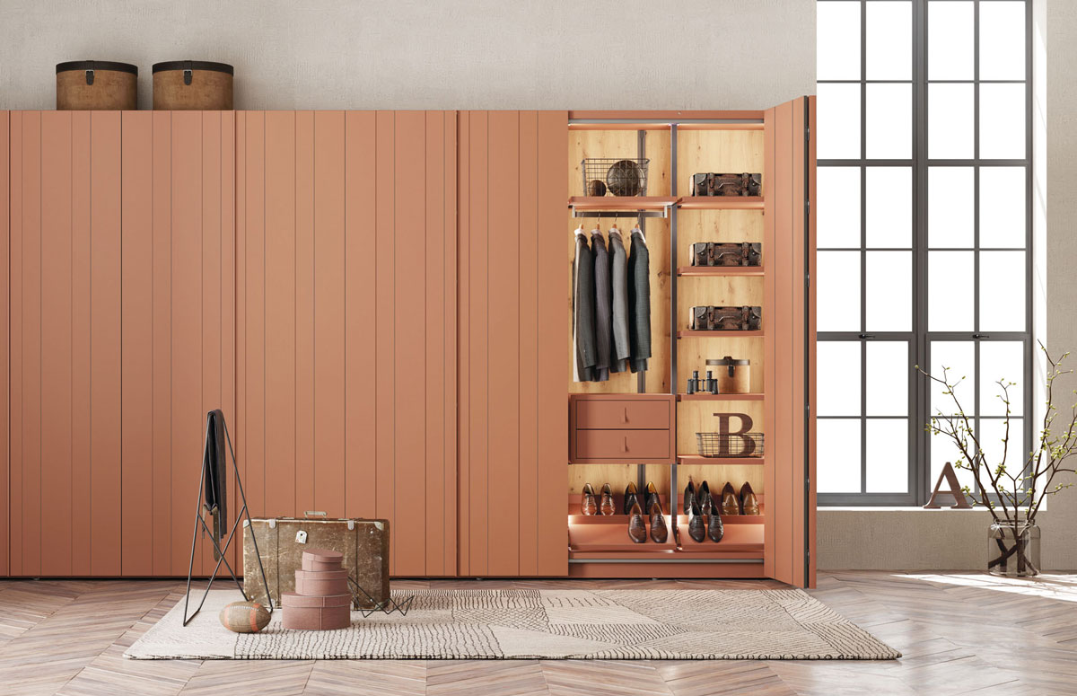 Armario con Frente AV de lamas de dos gruesos distintos (16 y 19 mm) que se van intercalando para formar el relieve que caracteriza a estas puertas. Cada una de las lamas se pueden personalizar con cualquier acabado y está disponible la versión combinado con cristal lacado. La apertura plegable de las puertas permite un acceso más cómodo al interior del armario.