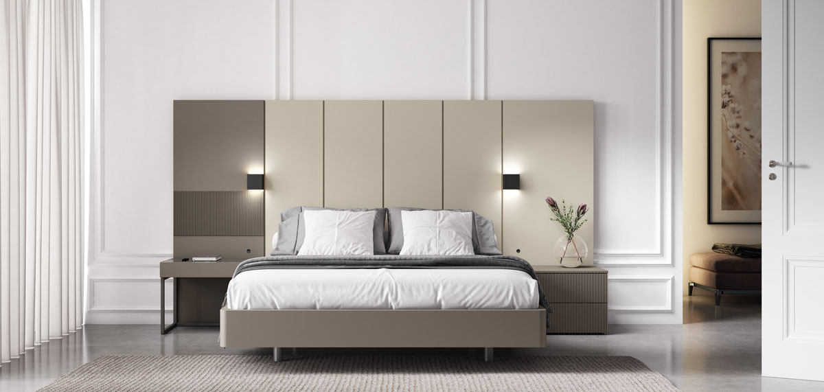 Dormiotorio de matrimocio con sistema de paneles rectangulares que combinados componen el cabezal de tu zona de descanso. Cabezal FREE en dos acabados lacados: Tórtora y Almendra. La mesita con bandeja extraíble en acabado Almendra y bandejas auxiliares en tono Tórtora son el detalle diferenciador de la composición.