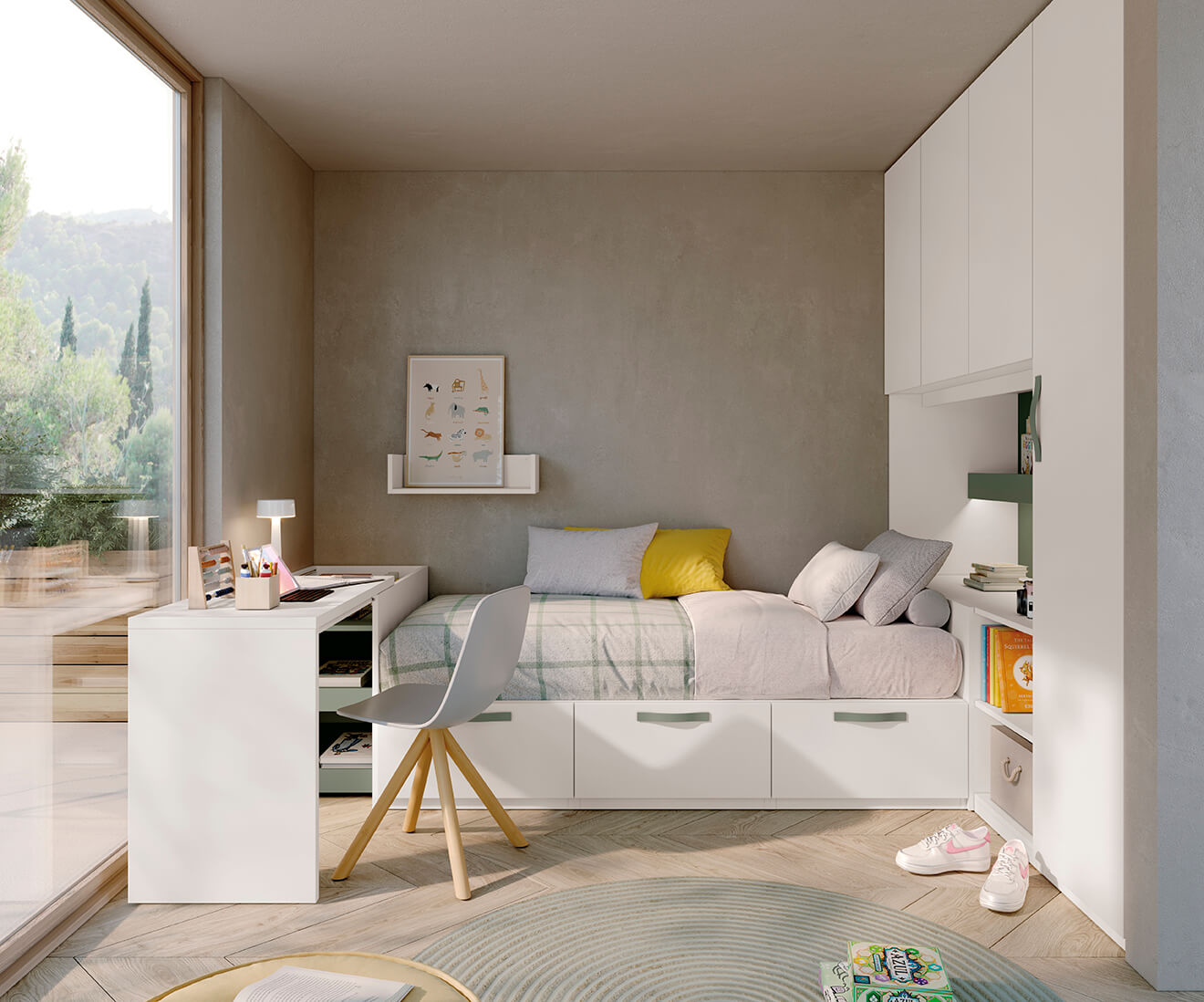 Propuesta para una pequeña habitación juvenil que incluye un arcón, escritorio extraíble y una cama con módulos Complet. El armario que completa el ambiente incorpora un altillo, un arcón y huecos que harán la función de mesilla de noche.