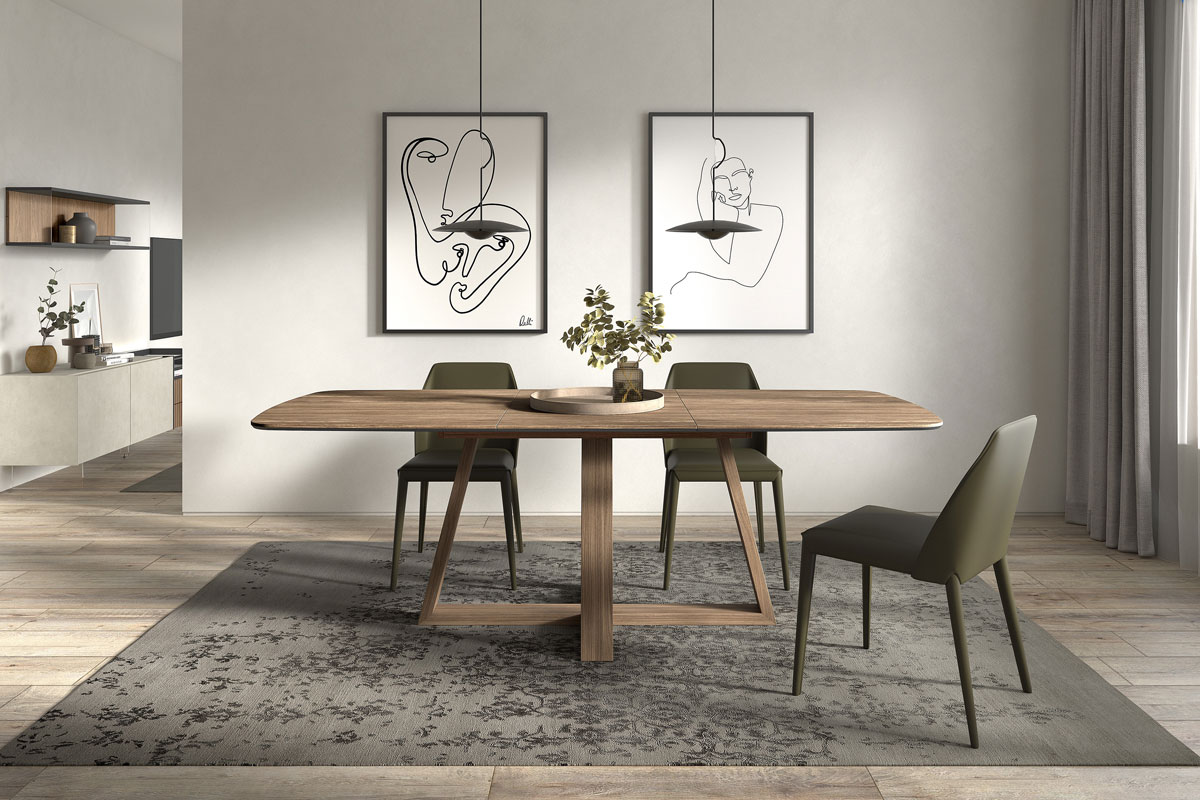 Una mesa sencilla y elegante con delgada tapa de canto de 1 cm más chaflán mdf negro, continuidad de la malla de madera. Extensible con volteador y sistema de apertura sincronizado. Color nogal tierra elige entre pata de madera o metálica. En Nogal tierra. Anchura total: 160 cm. Altura total: 90 cm.
