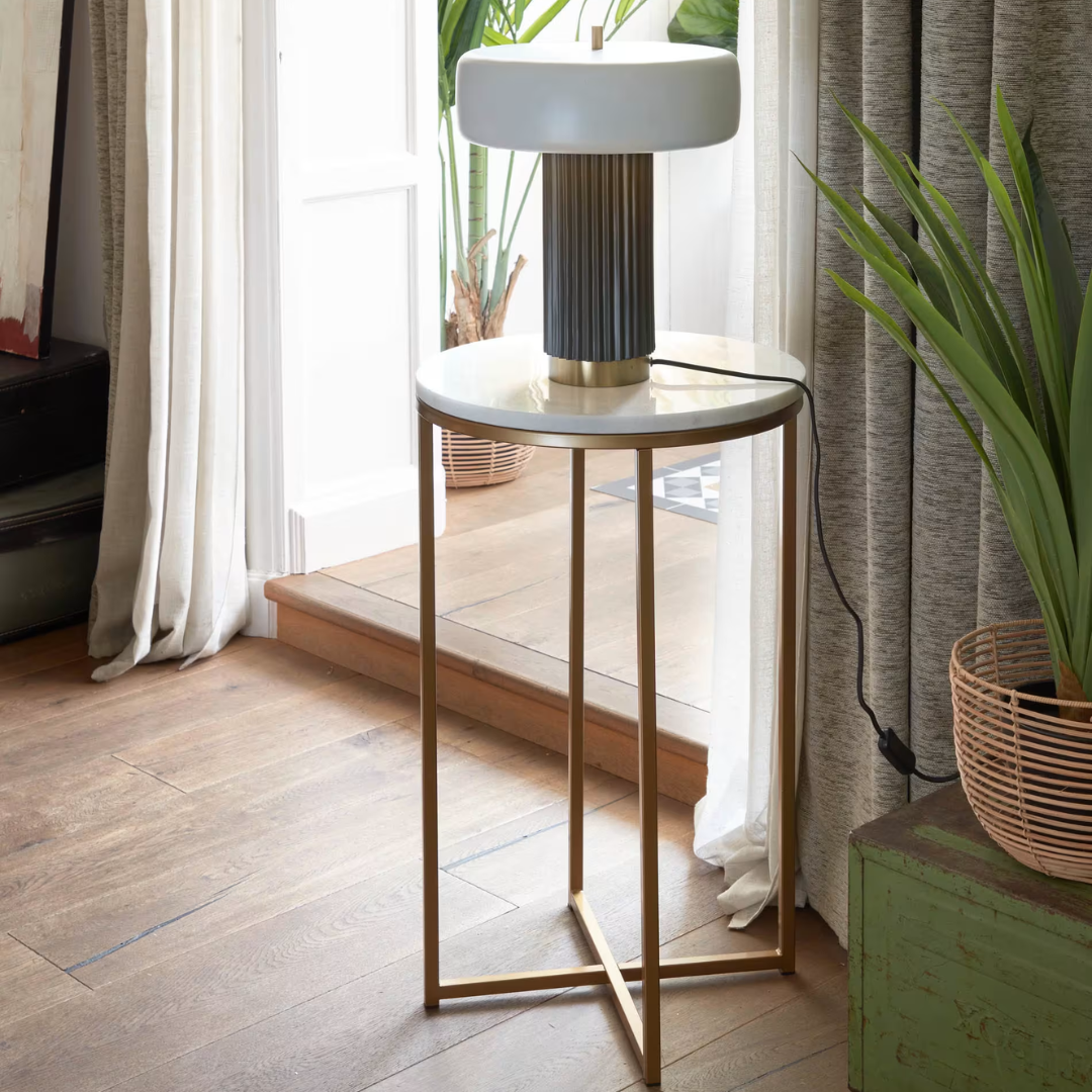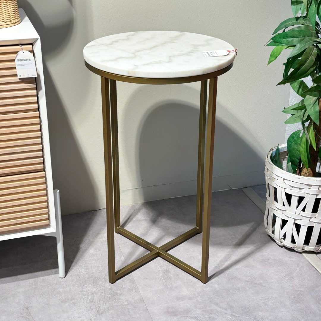 Sobre hecho con mármol blanco, lo que favorece la luminosidad y sensación en un espacio que añadirá elegancia. Estructura hecha de acero pintado con un acabado de color dorado mate. Pieza con un diseño que se adapta a cualquier estilo interior y estancia. Kave Home.