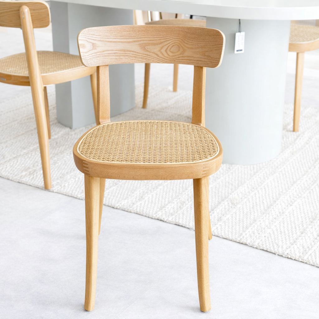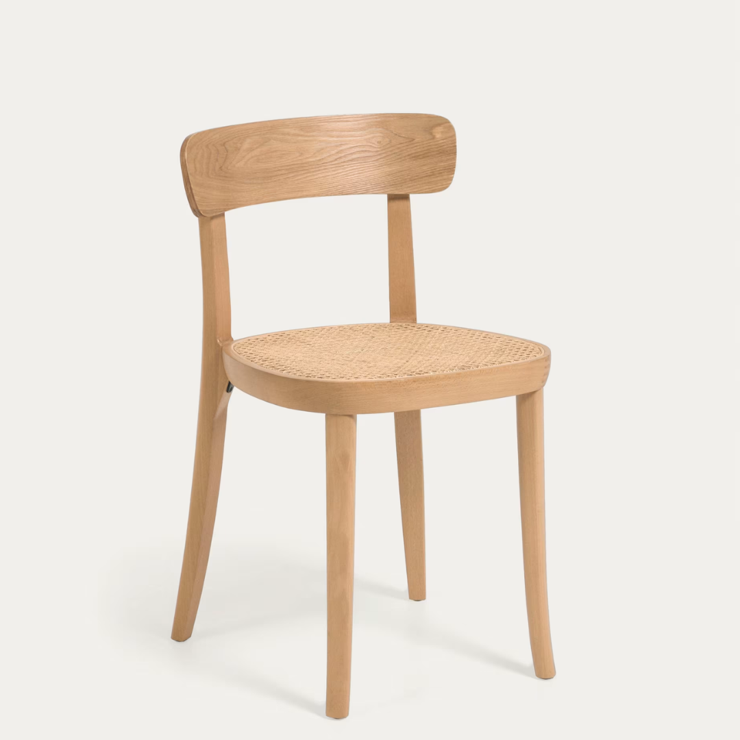 Silla de madera de haya y chapa de fresno. Asiento de ratán, reforzado con nylon para mantenerlo firme y estable. Kave Home.