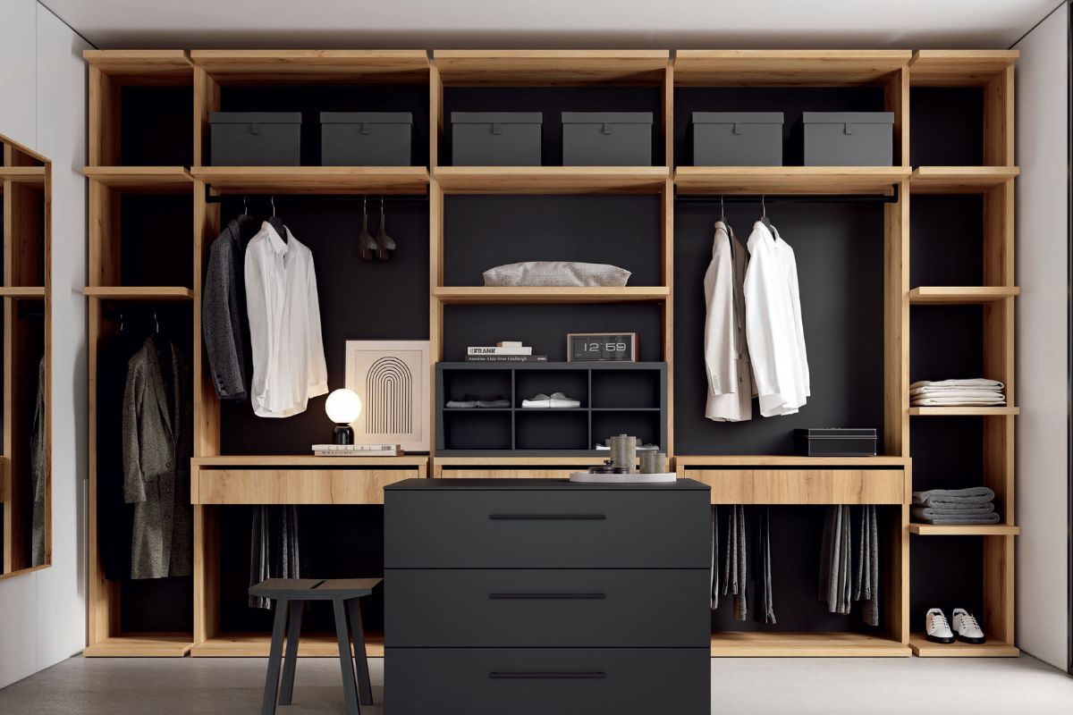 Vestidor abierto a medida con los estantes de más profundidad que los costados. Completa tu vestidor con una isla central de cajones para aquellas prendas que necesitas que estén ocultas a la vista. Medida vestidor: 380 x 58 x 242,8 cm. Medida isla: 100 x 84 x 73,8 cm. Medida espejo: 80 x 8 x 146 cm. TEGAR.